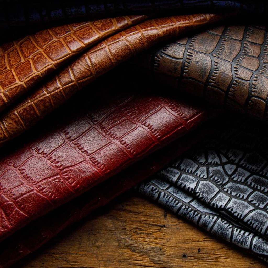 Crocodile Print Leather features an embossed pattern that mimics the luxurious look of genuine crocodile skin. This leather adds an exotic flair to products like handbags, belts, and shoes, offering a high-end aesthetic without the use of actual exotic hides.